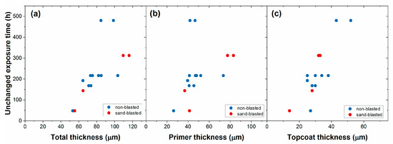 The effect of the (a) total, (b) primer, and (c) topcoat thickness on the unchanged exposure time in the salt-spray chamber. The panels were heat-treated (300 °C, 17 h), unroughened or sand-blasted cold-rolled steel sheets, coated with Bilayered Coating II.