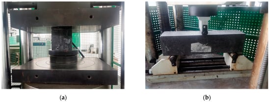 Test device for mechanical properties: (a) compressive strength test, (b) flexural strength test, and (c) splitting tensile strength test.