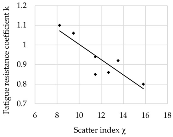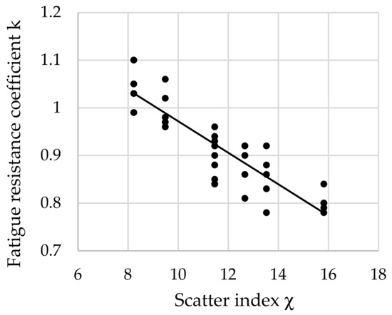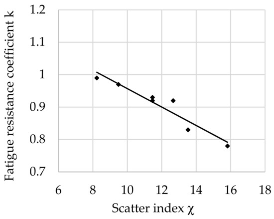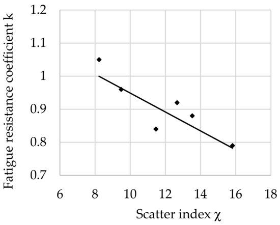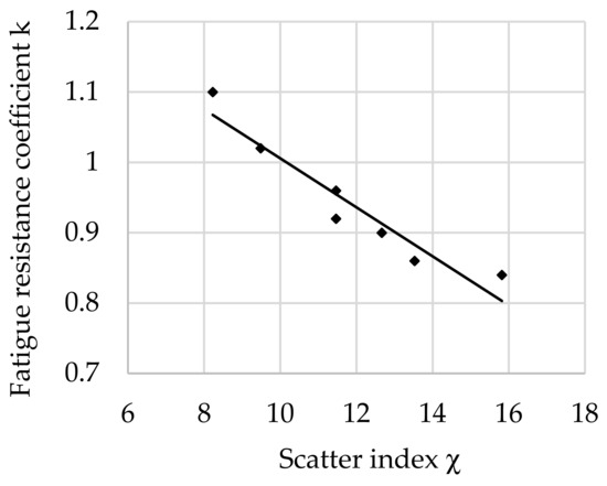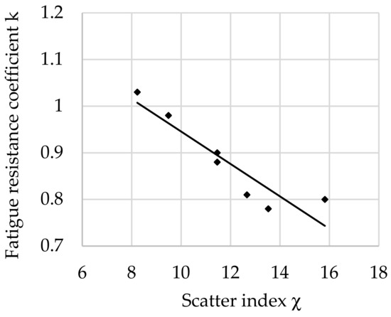 The relationship between the fatigue resistance coefficient and scatter index χ of structural steel hardened at 880 °C and tempered at 400 °C is shown in Figure 6.