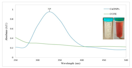The UV-Vis spectrograph of calcium oxide nanoparticles. CaONPs—calcium oxide nanoparticles; CCFE—C. colocynthis fruit extracts.