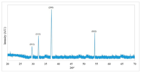 The X-ray diffraction (XRD) pattern of CaONPs showed sharp peaks, which depicted the crystalline properties of triturate. The diffractive peaks were shown at 29.61° (011), 32.17° (111), 37.27° (200), and 54.26° (022), corresponding to CaO (Figure 3).