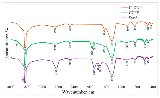 The Fourier-transform infrared (FTIR) spectra of calcium oxide nanoparticles. CaONPs—calcium oxide nanoparticles; CCFE—C. colocynthis fruit extracts, SynS—synergistic solution of CaONPs and CCFE.