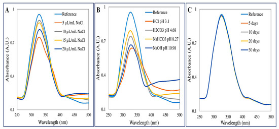 The stability of CaONPs was studied against salinity, time, and pH variations. The stability of prepared nanoparticles was assessed against different solutions of varying salinity ranging from 5 µL/mL to 20 µL/mL of 0.1 mM NaCl. It was noticed that minute changes occurred in the stability of CaONPs with increasing salinity (Figure 5A). The stability of CaONPs against different solutions of varying pH was also assessed. The stability of CaONPs was found to be significantly affected by pH changes (Figure 5B). The highest deviation from reference was noticed with NaOH (pH 10.98). To assess the stability of CaONPs’ optical density, prepared nanoparticles were assessed every 5 days. CaONPs were found to be highly stable over time (Figure 5C).