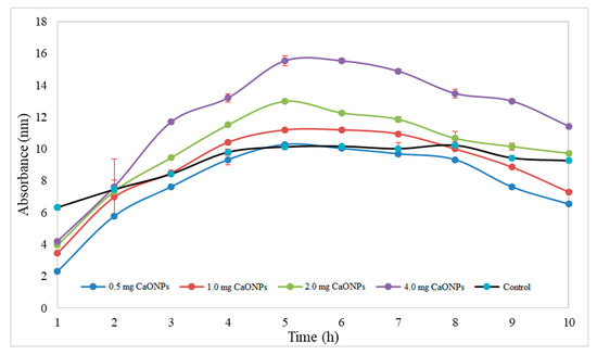 In vitro release of CaONPs was studied by the dynamic dialysis method using a dialysis membrane (8 kDa). It was found that greenly synthesized CaONPs have been reduced to a stable configuration. CaONPs in vitro release was measured every hour for a total of 10 h. A steady concentration of nanoparticles was released with very few variations (Figure 6). It was discovered that an increase in concentration during nanoparticle treatment was directly related to an increase in in vitro release. The released concentration of CaONPs kept increasing from 1 h to 6 h, then an almost steady decrease was noticed up to 10 h. No sharp variations in the release of CaONPs were noticed.