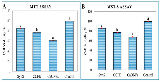 The in vitro cytotoxicity of CaONPs, C. colocynthis fruit extracts, and their synergistic solution were studied by MTT and WST-8 assays, and the results are presented in Figure 7. It was found that all the solutions showed a reduction in cell viability by MTT assay. The cell viability percentages by MTT assay were noticed to be (85.32 ± 0.75 c) by synergistic solution, (76.84 ± 1.05 b) by C. colocynthis fruit extracts, (60.67 ± 0.75 a) by CaONPs, and (99.40 ± 0.19 d) by the control. The cell viability determined by the WST-8 assay was significantly reduced by the synergistic solution (85.60 ± 0.98 c), C. colocynthis fruit extracts (77.06 ± 0.26 b), and CaONPs (67.34 ± 1.64 a) as compared to the control (99.34 ± 0.38 d) (Supplementary Table S2).