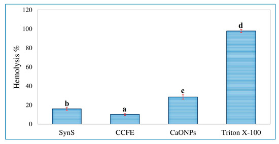 Due to their nanosize, ability to form coagulations, and extremely reactive nature, nanoparticles can destroy cell membranes, which is a hindrance to their use in living organisms. We have studied the cytotoxic effect of greenly synthesized CaONPs against macrophages to assess their toxicity for living cells. Using macrophages to assess the cytotoxicity of plant extracts is an easy, cost-effective, and reliable method [54,55]. The intention behind studying the biosafety of CaONPs is that, in the future, we want to study in vivo antidiabetic and antilipidemic activity using these nanoparticles. The cytotoxicity analysis showed that greenly synthesized CaONPs were not toxic to macrophages; when these nanoparticles were used in combination with the C. colocynthis fruit extracts, they showed great cell viability. Cell viability was discovered to be dose dependent. The results of the current study’s findings are identical to those of previous studies by Alayed et al. [56] and de Souza et al. [57]. The in vitro hemolytic analysis of the synergistic solution of CaONPs and C. colocynthis fruit extracts showed only 16 percent hemolysis; the results make them fit for use in vivo. The findings of our study are in accordance with previously reported research by Eram et al. [58]. Nanoparticles show better bioactivities and safety when used synergistically with plant extracts due to the fabrication of bioactive phytochemicals on their surface [59,60,61]. In this study, we have also found that synergistic solution of CaONPs and CCFE show less toxicity and enhanced bioactivity. It might be due to the formation of chemical conjugates between nanoparticles and bioactive phytochemicals in CCFE. There are a large number of phenolics and flavonoids including syringic acid, quercetin, vanilic acid, sinapic acid, and feralic acid in CCFE [48], which have ability to cap and stabilize the nanoparticles, making them less toxic [62].
