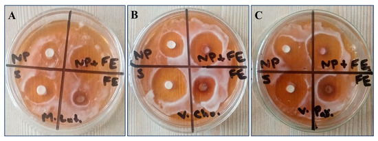 The zones of inhibition were measured to assess the antimicrobial potential of CaONPs, fruit extracts of C. colocynthis, and their synergistic solution. To prevent contaminations, all the procedures were carried out in a laminar flow (ESCO® Changi, Singapore). In all petri dishes, about 10 mL of PDA solution was poured and allowed to solidify for 2 h. After the PDA was solidified, a cork borer of 5 mm was used to dig the wells. About 2 mL of standard control and 2 mL of test solutions at different concentrations were poured into separate wells of the petri plates. The streak method was used to inoculate the microbial cultures. After the inoculation, all the plates were left in an incubator at 37 °C for 48 h and then the zones of inhibition (a clear area with no microbial growth) were measured. All the experiments were set up in triplicate.