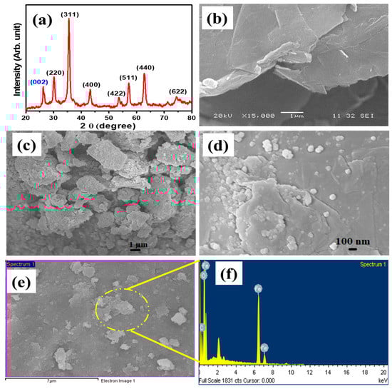 (a) XRD pattern of Fe3O4/Gr nanocomposite, (b) SEM image of graphene, (c,d) SEM image of Fe3O4/Gr nanocomposite, (e,f) SEM image and EDS analysis.