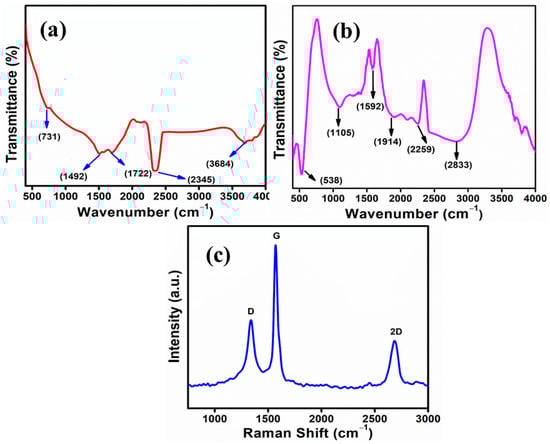 NCs of iron oxide and graphene were analyzed using FTIR to identify their chemical structure. Figure 2a presents the FTIR spectra of graphene where certain peaks are visible due to the attached functional group. However, peaks at 731 cm−1, 1492 cm−1, and 1722 cm−1 appeared with weak intensity which are attributed to the C=C bending, C-H bending, and C=O stretching, respectively [56,57,58]. The other strong peak is observed at 2345 cm−1 which is attributed to the O=C=O and another band appears at 3684 cm−1 which is attributed to O-H stretching. However, these bands are due to the partial oxidation of graphene-to-graphene oxide [59]. But most of the peaks which are due to partial oxidation of graphene, vanished in Fe3O4/Gr nanocomposite. In Figure 2b, the FTIR spectrum displays the peaks of nanocomposites (Fe3O4/Graphene) at different wavenumbers. Absorption peak of Fe3O4/graphene nanocomposites is observed at 538 cm−1, 1105 cm−1, 1592 cm−1, 2259 cm−1, and 2833 cm−1. First peak appeared at 538 cm−1 denoted the stretching vibration mode of Fe-O [53,60]. Two broad absorption peaks appear at 2833 cm−1 due to the stretching of C-H mode [61] and at 1105 cm−1 represents the stretching vibration of C=C mode [53,62] while another peak appear at 1592 cm−1 also denoted the stretching vibration mode of C=C [53,63,64]. The peak observed at 2259 cm−1 specifying the stretch vibration mode of C≡C [65]. Thus, corresponding peaks are related to the FTIR spectra of Fe3O4/Gr NCs and differ from the peaks of Gr/GO used as precursor in the synthesis of NCs.