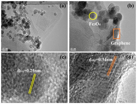 (a) TEM image of Fe3O4/Gr nanocomposite, (b–d) HRTEM images of nanocomposites showing Fe3O4 nanoparticles presented in circle shape (yellow color) corresponding to (311) plane with 0.25 nm interplanar lattice spacing (c) and rectangular shape shows the graphene (orange color) corresponds to (002) plane with 0.34 nm interplanar lattice spacing, presented in (d).