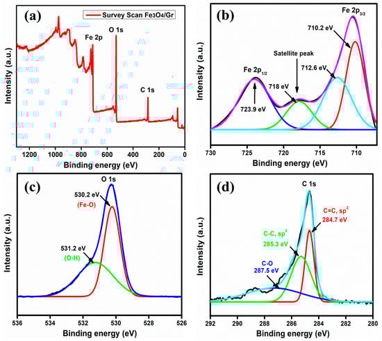 XPS survey scan of Fe3O4/Gr nanocomposites is shown in Figure 4a. The presence of peaks related to carbon, oxygen, and iron in the prepared material of Fe3O4/Gr nanocomposites confirms the nanocomposite synthesis. Figure 4b shows that there are 2p core levels of iron, such as, Fe 2p1/2 with binding energy of 723.9 eV and Fe 2p3/2 with binding energy of 710 eV. In Fe3O4, Fe exists in two states i.e., Fe2+ and Fe3+, so the peak observed at 710.2 eV (red color) corresponds to Fe2+ states and the peak observed at 712.6 eV (cyan color) corresponds to Fe3+ in Fe 2p3/2. Moreover, at 718 eV (green color), a satellite peak was observed, indicating that there is partial oxidation of Fe3O4 to Fe2O3 [68,69]. Figure 4c, d shows the spectrum of 1s core level of oxygen and carbon, respectively. In Figure 4c the peak of the oxygen atom appears at 530.2 eV (red color) attributed to the Fe-O bond and at 531.2 eV (green color) attributed to O-H bonds. The scan of C 1s core level spectrum is shown in Figure 4d. The peak in C 1s is obtained at 284.7 eV (red color) corresponding to C=C sp2 carbon atom and at 285.3 eV (green color) attributed to C-C sp3 atom. Moreover, the peak appearing at 287.5 eV (blue color) corresponds to C-O bonds which may be due to the functionalized group attached on graphene [70,71,72]. The XPS data also show that no reaction takes place between graphene nanosheets and iron oxide nanoparticles [11].