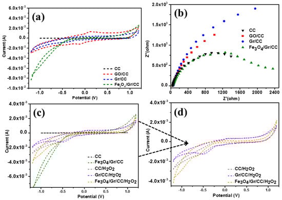 Electrochemical test of fabricated electrodes, (a) CV and (b) EIS of CC, GO/CC, Gr/CC, and Fe3O4/Gr/CC in 0.1 M PBS (pH = 7.0), (c) comparative CVs of CC, Gr/CC, and Fe3O4/Gr/CC in 0.1 M PBS (pH = 7.0) with and without H2O2 at a scan rate of 0.08 V s−1 (d) CVs of CC, Gr/CC, Fe3O4/Gr/CC with H2O2 in 0.1M PBS, pH=7.0 (CC/ H2O2, Gr/CC/ H2O2, Fe3O4/Gr/CC/ H2O2).