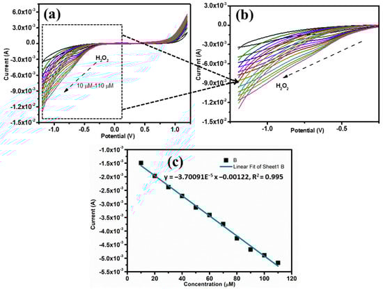 Using CV, it was also investigated how different H2O2 concentrations affected the electrochemical performance of Fe3O4/Gr/CC (Figure 6a). With a scan rate of 0.08 Vs−1, we were able to get various CV curves of Fe3O4/Gr/CC in the presence of varying concentrations of H2O2 from 10 μM to 110 μM (Figure 6a,b). The observations obviously demonstrated that the current response for reduction has increased at each addition of H2O2. The calibration plot for linearity check between the peak current response and concentration of H2O2 revealed that this improved current response was linear (Figure 6c). The linear equation was observed as y = −3.70091E−5 x −0.00122, and R2 = 0.995.