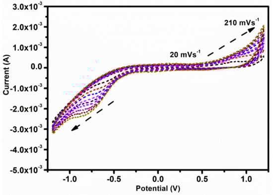 Additionally, we have also looked at the effects of various scan speeds on the Fe3O4/Gr/CC toward H2O2 for the electrocatalytic reduction H2O2 for sensing application (Figure 7). Figure 7 displays the CVs of Fe3O4/Gr/CC that were obtained at various applied scan speeds of 20–210 mVs−1 in 0.1 M PBS (pH 7.0) containing initial concentration of H2O2. We noticed that as the scan rate increased from 20 to 210 mVs−1, the peak current response at the reduction side increases as the scan speed increases. The obtained results show the responses of peak current at 20 to 210 mVs−1 and a linear plot can be obtained. This plot further provides the information that indicates the linear increase in the response of the peak current and suggests the process is diffusion controlled for the sensing of H2O2 [73].