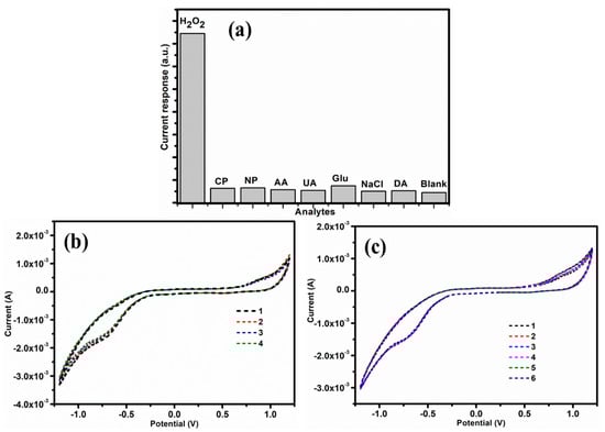 One of the most essential analytical parameters for sensors is selectivity. Several bodies, including glucose (Glu), uric acid (UA), ascorbic acid (AA), dopamine (DA), nitrophenol (NP), chlorophenol (CP), nitrophenol (NP), and sodium chloride (NaCl) were applied to test the anti-interference performance of Fe3O4/Gr/CC, as shown in Figure 8a. There was no noticeable current change after the addition of interfering species, and the current response to the addition of H2O2 was unaffected, confirming the exceptional selectivity. Further, CV curves were used to test the repeatability of the modified electrode (Fe3O4/Gr/CC) in order to evaluate the accuracy of the sensor. The results were repeatable, with a relative standard deviation (RSD) of 3.27% (four repeated runs at single electrode) (Figure 8b).