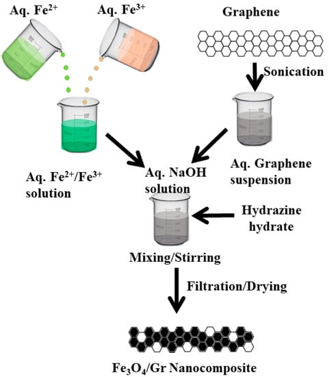 Nanocomposite was synthesized by conventional chemical co-precipitation method. First, in a separate beaker, both salts of iron (Fe2+/Fe3+) were taken in 1:2 ratios and dissolved in distilled water to obtain a clear aqueous solution. Second, ultrasonic treatment was given to as-received graphene powder in distilled water for 3 h and solid graphene sample was collected from aqueous solution using a centrifuge at 3000× g RPM. Both samples of iron oxide were transferred into the aqua treated graphene suspension and the mixtures were stirred for 30 min. A 2M NaOH aqueous solution was added into the mixture drop by drop with continuous stirring until the whole solution turns into black precipitates. Additionally, 10 mL of hydrazine hydrate was added to the solution to stop the oxidation of graphene into graphene oxide during NCs preparation. The precipitates obtained from nanocomposite were washed several times by using distilled water and dried in an oven at 70–80 °C for 4–5 h. A schematic representation of Fe3O4/Gr NCs fabrication is illustrated in Scheme 1.