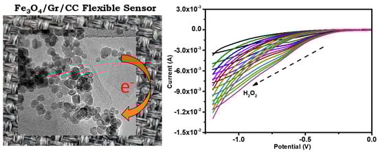 To further explore the sensing abilities of Fe3O4/Gr NC, we have successfully synthesized these NCs via chemical co-precipitation method. The electrochemical performance of bare electrodes, Fe3O4/CC and Fe3O4/Gr NCs, was analyzed. All sensing parameters such as, LOD, sensitivity, selectivity, stability, and reproducibility were performed. Fe3O4/Gr/CC shows the better sensing ability such as high selectivity and high reproducibility toward H2O2. Moreover, Fe3O4/Gr/CC NCs-based flexible electrodes show a good linear range and a low detection limit for H2O2 detection.