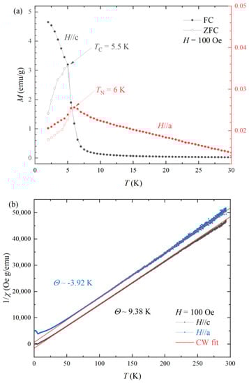 Figure 2a exhibits the temperature-dependent magnetization M(T) with zero-field-cooling (ZFC, open symbol) and field-cooling (FC, closed symbol) thermal hysteresis under a static magnetic field of H = 100 Oe. The spin glass-like thermal hysteresis was found in other RAlGe compounds [15,16]. The divergence of FC and ZFC may be associated with the helical spin structure along the c-axis [12]. There are antiferromagnetic transitions at TN = 5.5 K and 6 K for applying magnetic fields along the H//c and H//a, respectively. There is a sizable ZFC and FC divergence in thermal hysteresis for H//c. The magnetization for H//c (left axis) has two orders of magnitude larger than those of H//a (right axis), indicating the significant anisotropic magnetic structure. The M(T) of field-cooling for H//c seems to be a ferromagnetic ordering rather than an antiferromagnetic transition.