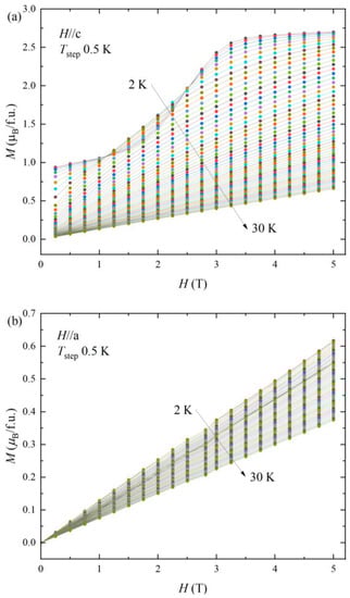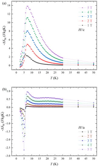 The calculated values of the ∆SM are depicted in Figure 4. The ∆SM for H//c in Figure 4a reveals a considerable MCE value −∆SM = 13.8 J kg−1 K−1 at H = 5 T and Tpeak = 7 K (Tpeak; temperature of ∆Smax). On the other hand, the entropy change in the antiferromagnetic state for H//a presents a positive ∆SM value ∆SM = 2.64 J kg−1 K−1 at H = 5 T, Tpeak = 6 K, indicating the inverse magnetocaloric effect (I-MCE). The maximum peak temperature Tpeak of −∆SM is a little bit increased from 6 K (H = 1 T) to 7 K (H = 2 T), which is attributed to the metamagnetic spin reorientation. The Tpeak is not changed for higher magnetic field ranges (H ≥ 2 T). The full width-half maximum of −∆SM also increased for higher magnetic fields, indicating that the metamagnetic spin reorientation under high magnetic field enhances the −∆SM, Tpeak and cooling power. Tpeaks of MCE and I-MCE are higher than the values of critical temperatures TC = 5.5 K and TN = 6 K for H//c and H//a, respectively. The different peak temperatures and the temperatures of magnetic ordering can be accounted by the 3D Heisenberg model and tricritical mean field model [18,19].