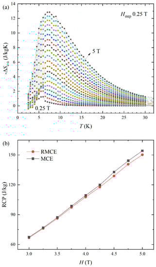 The anisotropic magnetic structure with ferromagnetic and antiferromagnetic states along the H//c and H//a-axis results in a significantly different spin entropy change. The anisotropic spin entropy change possesses the promising R-MCE property. Figure 5a presents the R-MCE property with a temperature of NdAlGe under various magnetic fields. The rotational spin entropy change is defined by ∆SR = ∆Sc−a = ∆Sc − ∆Sa [20,21]. The NdAlGe exhibits relatively large R-MCE performance, as shown in Figure 5a, due to sign reversal between MCE and I-MCE for different crystal orientations. The ∆SR exhibits a very large value ∆Sc−a = −12.85 J kg−1 K−1 at Tpeak = 7.5 K H = 5 T. The ∆SR enhances over a wide temperature range compared to the ∆SM of H//c.