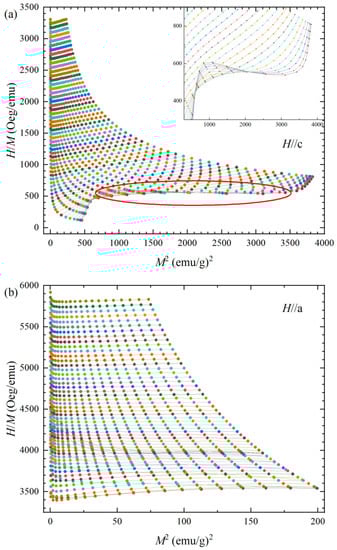 Figure 6a represents the Arrott plot H/M versus M2 for H//c. As the induced magnetic field increases, a positive slope is observed over a wide field regime. The positive slope becomes negative during a slow spin reorientation region, as marked with a red circle in Figure 6a. The positive slope in the Arrott plot indicates the second-order magnetic transition (SOMT). The negative slope region indicates that the spin reorientation is the first-order magnetic transition (FOMT). The FOMT exhibits a significantly higher maximum value of ∆SM, albeit with a relatively narrow full width and half maximum δFWHM. Consequently, materials exhibiting FOMT may possess an average or lower RCP [21,24]. In contrast, SOMT materials exhibit a relatively broad δFWHM and a lower maximum ∆SM than those of FOMT. Typically, the SOMT materials have small magnetic hysteresis, offering the advantage of better MCE performance.