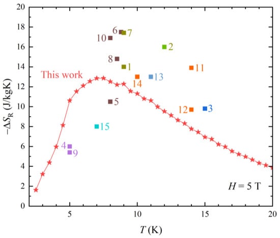Recently, cryogenic MCE also been devoted to increasing the performance, reaching 2 K. EuTiO3 exhibited a substantial MCE performance of −∆SM = 40 J kg−1 K−1 [5]. Furthermore, the current research in hydrogen storage technology involves liquefied hydrogen with liquefaction at low-temperature range, around 20 K [6]. The high MCE performance near the hydrogen liquefaction temperature can be applied to low temperature cryogenic cooling technology.