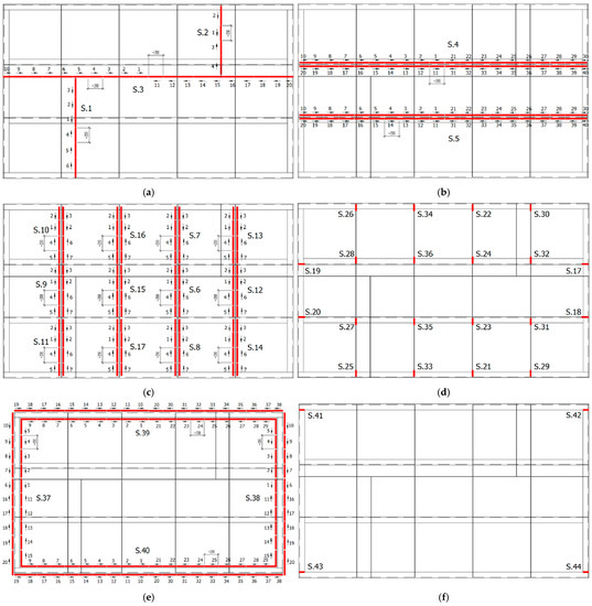 Sequence of welds in the numerical simulation of the welding process of the industrial furnace wall panel; (a) welds S.1–S.3 joining metal sheets (stage 1), (b) welds S.4 and S.5 joining ribs made of angles to the metal sheets (stage 2), (c) welds S.6–S.17 joining the ribs made of flat bars to the metal sheets (stage 3), (d) welds S.18–S.36 joining the ribs made of flat bars to the channel sections of the frame and ribs made of angles (stage 4), (e) welds S.37–S.40 joining the channel sections of the outer frame to the metal sheets (stage 5), and (f) welds S.41–S.44 joining the channel sections of the outer frame (stage 6).