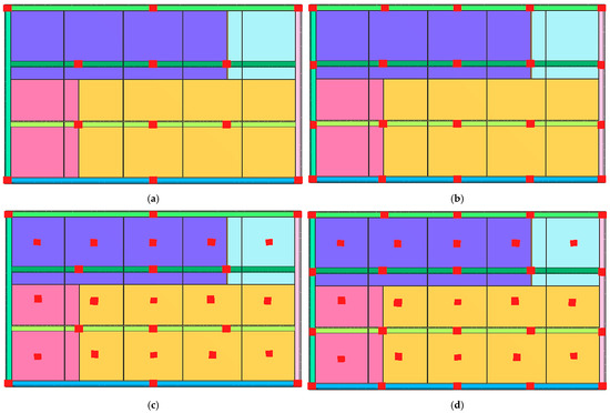 Diagram of the distribution of restraint points in four variants of the numerical simulation of the welding process of the industrial furnace wall panel; (a) model 1, (b) model 2, (c) model 3, and (d) model 4.