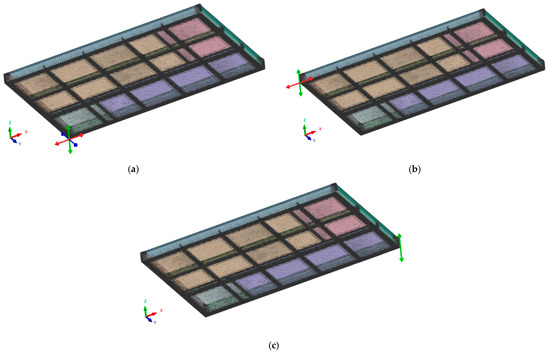 Diagrams of restraint boundary conditions after panel welding; (a) no node displacement in the X, Y, and Z directions, (b) no node displacement in the X and Y directions, and (c) no node displacement in the Y direction.