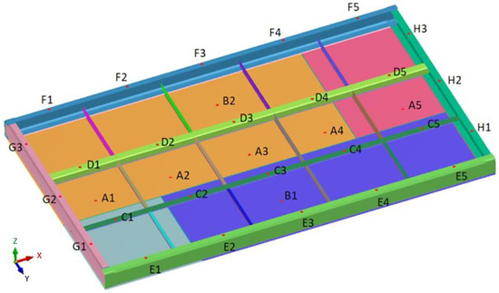 Prior to the welding process, preliminary measurements were made. The measurements took into account the distances between characteristic points C1–C5, D1–D5, E1–E5, F1–F5 (direction of the X axis), and G1–G3 and H1–H3 (direction of the Y axis), as well as the values of relative height (in the direction of the Z axis) at characteristic measurement points. These measurements were carried out using a linear gauge (Stanley, Hartford, CT, USA) and a laser instrument (Bosch Power Tools, Warszawa, Poland). After the welding process, measurements were taken again.