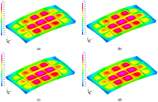 The distribution of the deformation fields of the industrial furnace wall panel in the direction of the X, Y, and Zaxes, resulting from the welding process with different restraint models, are shown in Figure 10, Figure 11 and Figure 12.