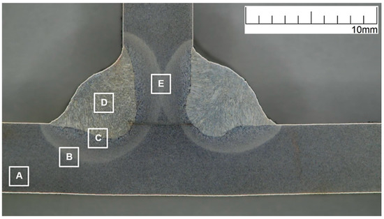 The microstructure of the welded joint was analyzed in individual areas of the joint (A–E), according to the diagram shown in Figure 13.