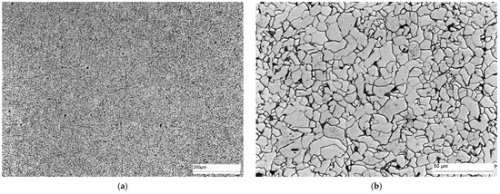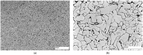 Microstructure of area A of the welded joint—parent material: (a) 100× magnification, and (b) 500× magnification. Ferrite—white precipitates, and perlite—dark precipitates at the ferrite grain boundaries.