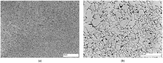 Microstructure of area B of welded joint—HAZ: (a) magnification 100×, and (b) magnification 500×. Ferrite—white precipitates, and perlite—dark precipitates at the ferrite grain boundary.