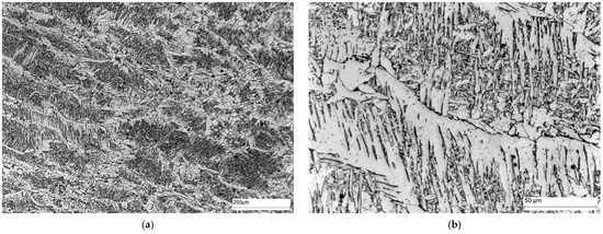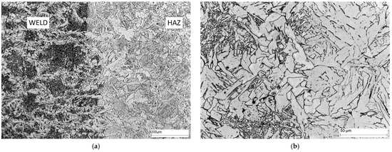 Microstructure of area D—weld: (a) 100× magnification, and (b) 500× magnification. Widmanstätten ferrite—white precipitates with different morphology, quenching products, mainly bainite—dark precipitates.