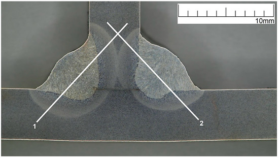 Metallographic tests were carried out to reveal the microstructure of the welded joint area (weld, fusion zone, heat affected zone and parent material). Due to the large number of welds, one of the welds connecting the ribs made of flat bars to the plate (welds S.6–S.17 Figure 3c) was selected for metallographic examination.