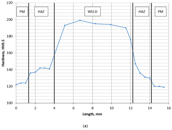HV5 hardness distribution in the welded joint area; (a) measurement line 1, and (b) measurement line 2. PM—parent material, HAZ—heat-affected zone.