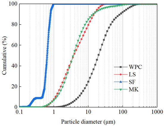 White Portland cement (WPC), supplied by Jiangxi Yinshan White Cement Company (Yinshan, China) and conforming to the Chinese standard GB/T 2015–2017 [28], was used to reduce the influence of paramagnetic substances on LF-NMR testing. The limestone powder (LS), silica fume (SF), and metakaolin (MK) were supplied by local vendors. Their chemical compositions measured by X-ray fluorescence (XRF) are given in Table 1, and their particle size distributions determined by laser granulometer are presented in Figure 1. Two kinds of quartz sands were utilized as aggregates. Sand 1 had particles size between 0.212 mm and 0.380 mm, and sand 2 between 0.380 mm and 0.830 mm. Superplasticizer used was polycarboxylate superplasticizer. The water used in this work was tap water.