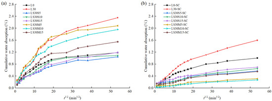 Figure 3 shows the cumulative water absorption (CWA) of the samples. CWA of all samples under both conditions increased with immersing time, and it increased rapidly in the first 6 h, then slowly continued to increase, which was discovered in many literature [14,48]. Under standard curing condition, L30 represented the highest CWA for 2.352% at 48 h on account of the dilution effect of high volume of LS, which reduced hydration products [22]. Samples containing SF exhibited a lower CWA in comparison to samples containing MK, which was in line with the results discovered by Tafraoui [9]. Incorporation of 5% SF reached the lowest CWA for 1.044% at 48 h soaking time, i.e., 53.66 sqr (time/min), 1.25 times lower than that of L30.