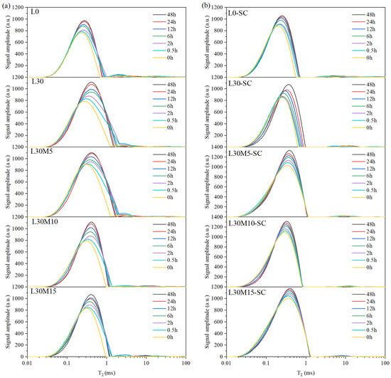 T2 spectra collected at 0 h, 0.5 h, 2 h, 6 h,12 h, 24 h, and 48 h during water absorption for specimens L0, L30, L30M5, L30M10, L30M15, L0-SC, L30-SC, L30M5-SC, L30M10-SC, and L30M15-SC were presented in Figure 5. The spectra of standard-cured samples in Figure 4a displayed a bimodal or trimodal distribution including a main peak and 1 or 2 small peaks, while steam-cured groups in Figure 4b had a main peak. The abscissa value corresponding to the main peak vertex is defined as T2-peak. Evolution of T2-peak during the water absorption for each specimen is plotted in Figure 6.
