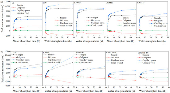Figure 8 depicted the peak area increment, subtracting the peak area of dry samples, of different pores during water absorption process, encompassing water in the specimen, gel pores, capillary pores, and microcracks or air voids. Evidently, for all specimens regardless of curing condition, the change of capillary water followed the same trend as the total water in the specimen. The results were in accordance with the literature [26]. The signal variation of water in gel pores differed for L0 and L0-SC group compared to the other groups containing 30% LS, as gel pores water slowly increased for L0 and L0-SC (same as [26]) mainly due to the characteristics of gel swelling [26,55,56] while decreasing for the latter. The reduction in gel pores was directly related to the addition of LS, implying that the addition of LS resulted in pore coarsening of the UHPC matrix slightly during water absorption. The reduction rate of gel pores at 48 h water absorption time for L30, L30M5, L30M10, and L30M15 were 14.00%, 5.73%, 9.26%, and 10.61%, respectively, and for L30-SC, L30M5-SC, L30M10-SC, and L30M15-SC were 18.29%, 3.91%, 8.40%, and 9.59%, respectively, which indicated that MK could mitigate this degradation under both curing conditions. This may be attributed to the aluminum phase present in metakaolin, which bridges C-S-H and makes the hydration products and UHPC matrix denser [57]. Additionally, the micro-aggregate and filling effects of metakaolin particles further refine the pore structure [58,59]. In addition, the signal of water in the microcracks or air voids remained stable throughout the water absorption process. A similar result was obtained in earlier findings [27]. This can be explained by the fact that the larger the pore size, the lower the capillary suction stress, and the less the amount of absorbed water [27].