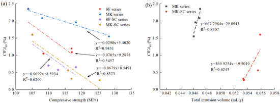 Figure 9a shows the relationship between compressive strength and CWA48. CWA48 decreased with increasing compressive strength, as reported in the literature [16,61]. MK and MK-SC series had a higher R2 than SF and SF-SC series, indicating the type of SCMs that had an effect on the relationship. Additionally, CWA48 steam-cured samples were smaller than that of standard-cured samples at the same strength value.