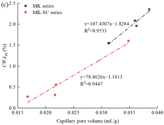 Figure 9b,c depict the relationship between the total intrusion volume and capillary pore volume (10–200 nm) tested by MIP with respect to CWA48. Figure 9b shows that a good linear relationship was found between the total intrusion volume and CWA48 for MK series (R2 = 0.8407), but a weaker correlation for MK-SC series (R2 = 0.6243). Despite possessing a greater total intrusion volume than MK series, the MK-SC series exhibited a lower CWA48, thereby indicating that UHPC matrix with a higher total pore content may not necessarily exhibit higher water absorption capability. In other words, the total pore volume does not singularly determine the water absorption performance, which is different from normal concrete with a high water-binder ratio (>0.3) [48,56].