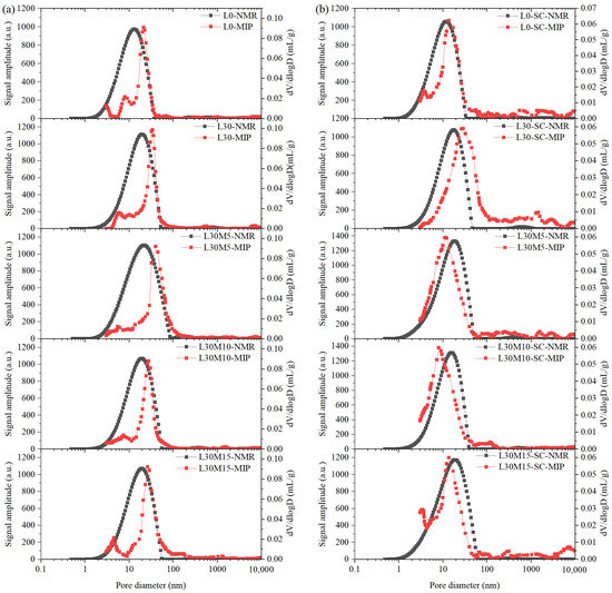 Comparisons of the PSD measured by LF-NMR and MIP: (a) Standard curing; (b) Steam curing.