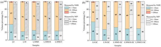 The volume percentage for different types of pores measured by LF-NMR and MIP: (a) Standard curing; (b) Steam curing.