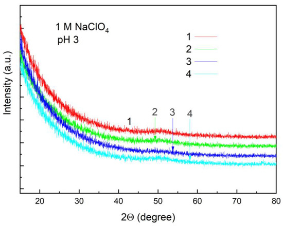 GI-XRD data for the p-Si ALD coated with 10 nm Al2O3 (1) and after immersion for 30 min in 1 M NaClO4 (pH 3) (2), drying and annealing at 400 °C (3), and repeated exposure to the electrolyte (4). The curve numbers correspond to the numbering in Table 1.