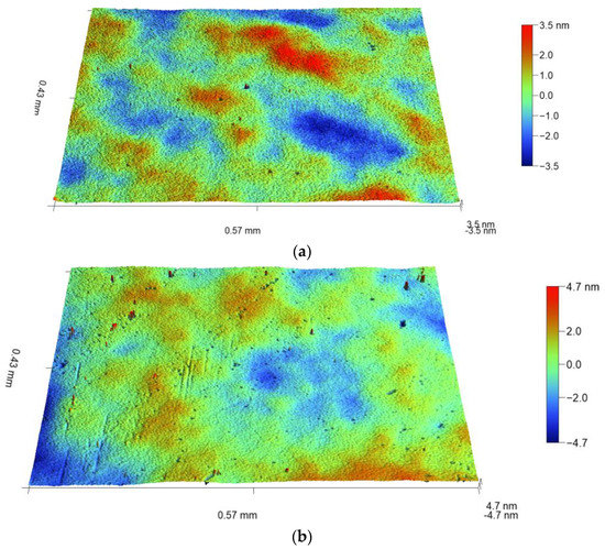Figure 3 compares the topographical features of the as-deposited sample (a) to those after the sample immersion in electrolyte and annealing (b). The treatment sequence for sample 4 is indicated in Table 1. The scales given in color characterize the peak-to-valley distance (∆d). The maximum value of the as-deposited sample is ∆d = 7 nm. This value also includes possible contribution from the Si substrate. The same sample after immersion and annealing is characterized by a higher value (∆d = 9.4 nm). The surface roughness also increases from Sa = 2.23 nm to 4.76 nm. Note that the parameter Sa (Figure 4) differs from the parameter ∆d (Figure 3). The parameter Sa means average roughness, which is calculated as an arithmetic average of the absolute values of the height deviations from the best-fitting plane over the complete 3D surface. The thickness of the oxide layer also increases slightly from h = 8.12 nm to 9.11 nm during the exposure. Altogether, these data do not indicate any evidence of the oxide dissolution. An increase in the film thickness implies an expansion of the oxide structure due to electrolyte accommodation.