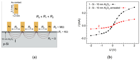 A four-point configuration was applied to measure resistance of the ALD Al2O3 films. The contacts on the samples were made by thermal evaporation using a vacuum evaporation system VAKSIS PVD-Vapour-5S Th. Rectangular contacts (1.2 mm × 3.1 mm) were formed using a template. After ALD coating, the Si-Al2O3 sample was cut into two equal parts: one for the as-deposited studies and another for the studies of annealing. By doing so, uncertainties and data scattering due to variation of substrate properties as well as the ALD procedure are minimized. In the same ALD batch, an Al2O3 layer on a glass wafer for resistance studies was also produced. The current–voltage (I–U) characteristics were measured using a U3606A multimeter/DC Power Supply from Agilent Technologies. The characteristics of two adjacent gold contacts on the Al2O3 layer were measured.