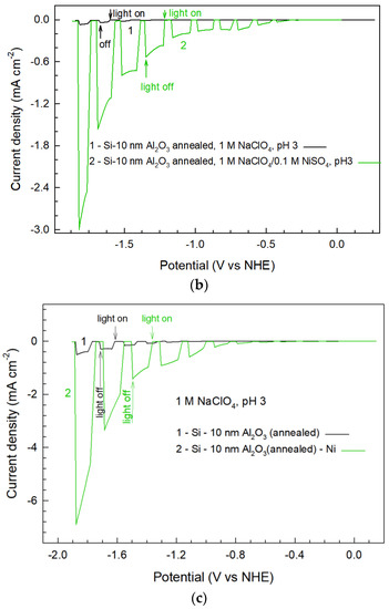 The ultrathin alumina film provides an opportunity for localized PEC deposition of a metal catalyst. Typically, the passive films on crystalline substrates are not completely uniform and homogeneous. In electrolyte, local corrosion sites can, first of all, occur at the “weak” sites, such as structural defects, micro-cracks, etc. The surface inhomogeneities can play the role of a certain matrix for the localized deposition of a metal catalyst. Figure 6b shows the voltammetric diagram, which characterizes the PEC deposition of Ni. The photocurrents also include HER contributions. Obviously, extensive photocurrents are induced when Ni2+ is added to the electrolyte. The currents drop to negligible values when illumination is terminated. The photocurrents in the electrolyte without Ni2+ are negligible when compared to those in Ni2+-containing electrolyte.
