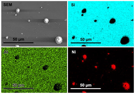 SEM–EDS images of the p-Si coated with 10 nm Al2O3 layer after photoelectrochemical Ni deposition in 1 M NaClO4 + 0.1 M NiSO4 electrolyte (pH 3). Images identify randomly distributed Ni microformations. The elements are identified by color: cyan—silicon, green—aluminum, red—nickel. Ni was deposited under potentiodynamic conditions, as outlined in Figure 6b.